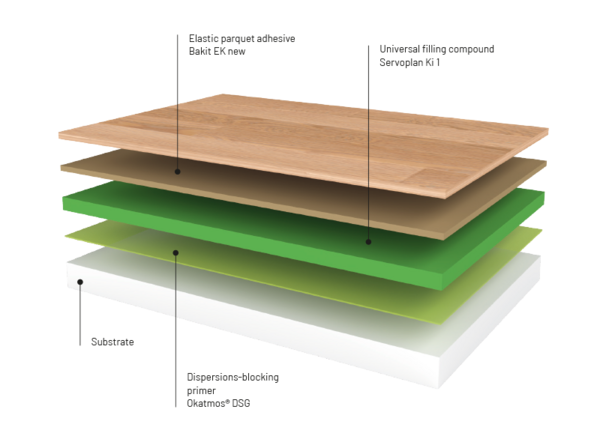 If you choose a room design with parquet flooring, you want a natural feel. Wood is living, and it breathes with this user. This sustainable room feeling can be accentuated through the use of low-emission and resource-saving laying fitting materials. Especially when laying new parquet flooring on suitable substrates, the use of the new “Bakit EK” is also possible without primer and filling compound. This reduction in material represents the essence of our sustainable approach.