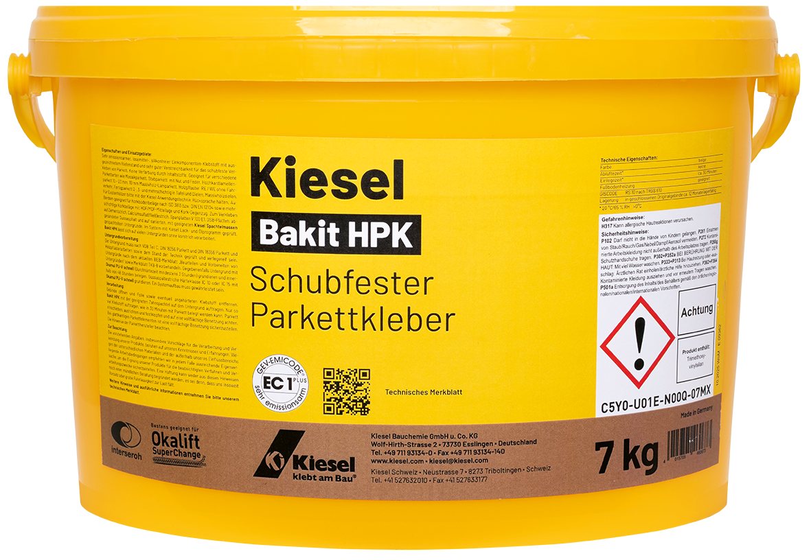 Suitable for various types of parquet such as mosaic parquet, strip parquet with tongue and groove, upright lamella parquet 10-23 mm, 10 mm solid wood lamella parquet, wood block RE/WE without traffic up to 25 mm, prefabricated parquet 2-, 3- and multi-layered in boards and planks, solid wood planks. Please consult with the Kiesel application technology department for exotic woods. Also suitable for cork floor coverings according to ISO 3813 or DIN EN 12104 as well as multi-layer cork floor coverings with MDF/HDF core layer and cork backing.