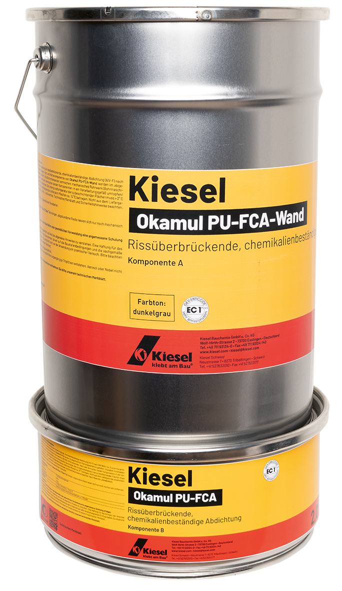 Solvent-free, pigmented polyurethane resin made of 2 components for sealing wall and floor surfaces under natural stone and ceramic coverings, e.g. in indoor and brine baths (‹ 1.2 bar), commercial kitchens, laboratories, production rooms of the beverage and food industry, as well as in wet and underwater areas of residential construction. Okamul PU-FCA Wand is preferably used on wall surfaces and Okamul PU-FCA Boden on floor surfaces.