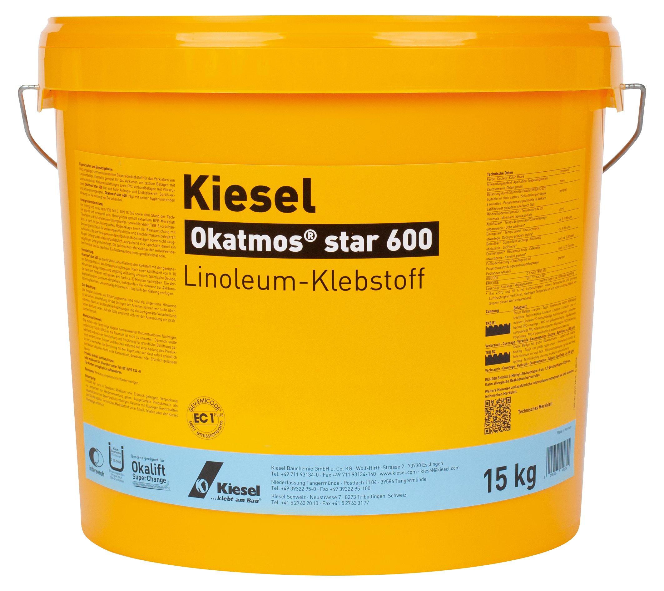 High yield, very low emission dispersion adhesive for bonding linoleum. Suitable also for the bonding of textile coverings with different backings, and PVC laminated flooring with fleece backing. Okatmos® star 600 has a high initial and final adhesion. Spray-Ex and cleaning agents suitable. Okatmos® star 600 prevents odours thanks to its sanitizing characteristics.
